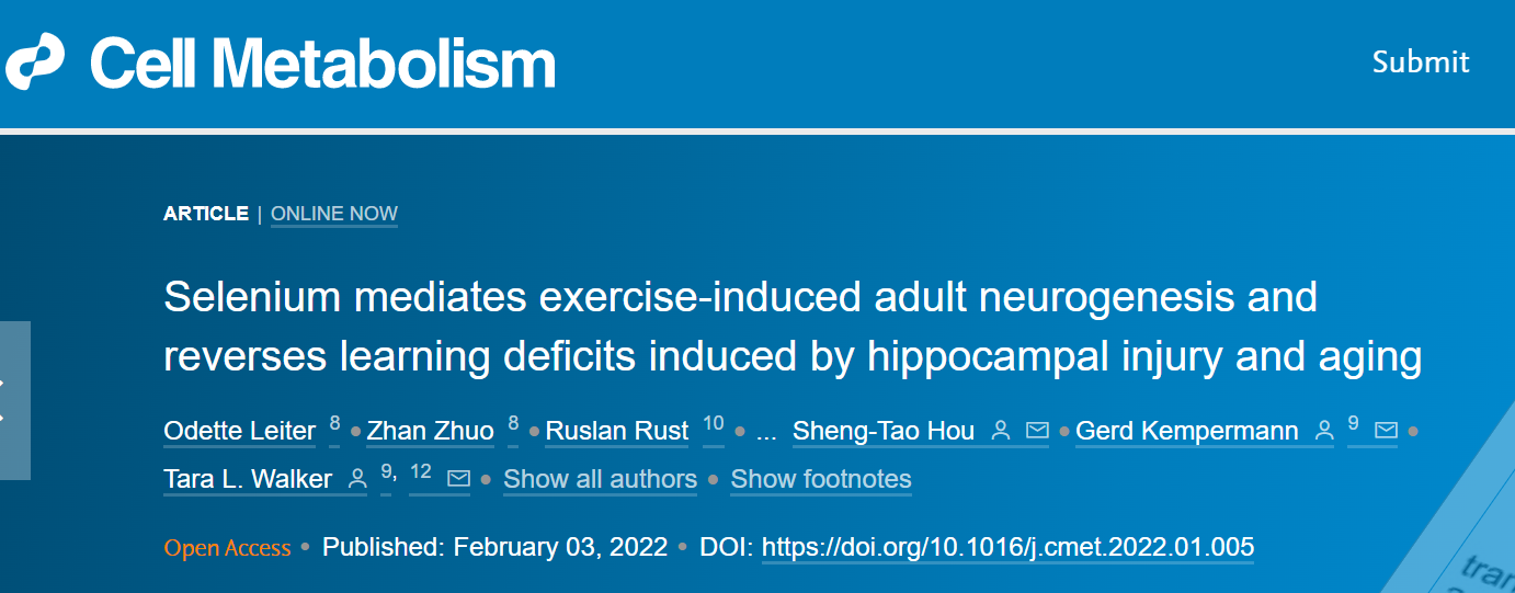 硒作為一種必不可少的營養(yǎng)微量元素,也是我們飲食的重要組成部分。近期,昆士蘭大學(xué)發(fā)表了研究,發(fā)現(xiàn)硒可以逆轉(zhuǎn)中風(fēng)對認(rèn)知的影響,并提高衰老大腦的學(xué)習(xí)和記憶能力。相關(guān)研究發(fā)表在《Cell Metabolism》上,題為“Selenium mediates exercise-induced adult neurogenesis and reverses learning deficits induced by hippocampal injury and aging”。
