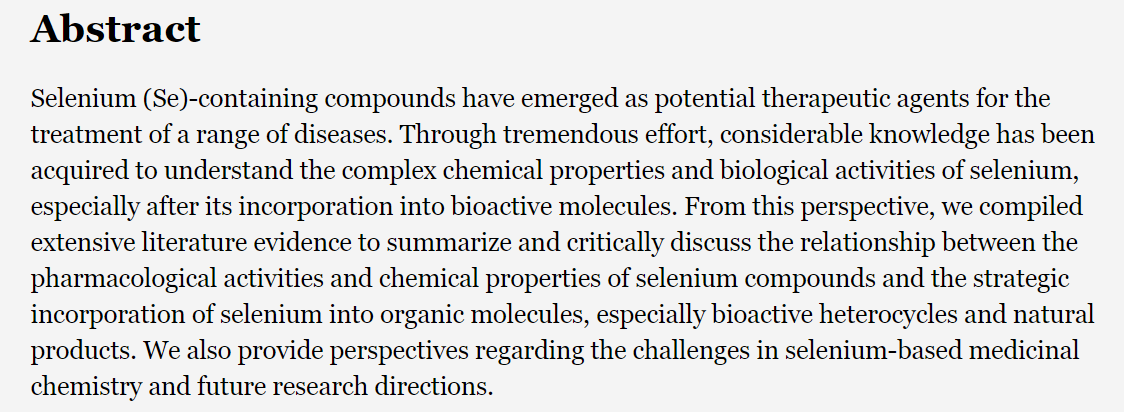 近期,應(yīng)藥物化學(xué)期刊Journal of Medicinal Chemistry 雜志Perspectives專(zhuān)欄編輯Nicholas A. Meanwell博士的邀請(qǐng),浙江工業(yè)大學(xué)侯衛(wèi)博士和上??萍即髮W(xué)許紅濤博士以“Incorporating Selenium into Heterocycles and Natural Products─From Chemical Properties to Pharmacological Activities”為題分析了硒的特殊化學(xué)性質(zhì)與其藥物化學(xué)生物學(xué)性質(zhì)之間的關(guān)系(圖2),并通過(guò)一些典型的含硒類(lèi)雜環(huán)小分子和天然產(chǎn)物案例分析來(lái)進(jìn)行佐證,這些信息對(duì)含硒藥物的合理設(shè)計(jì)具有一定的指導(dǎo)意義。