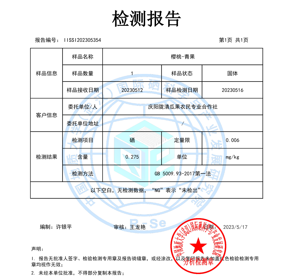 2023年5月初,公司收到甘肅慶陽某富硒櫻桃基地郵寄過來的櫻桃小果樣品。經(jīng)中國地質(zhì)大學(xué)(武漢)國際硒科學(xué)與產(chǎn)業(yè)發(fā)展研究院檢測,樣品濕基硒含量達(dá)到0.275mg/kg,滿足富硒水果硒含量要求。目前櫻桃還未成熟,后續(xù)將進(jìn)行持續(xù)跟蹤檢測。